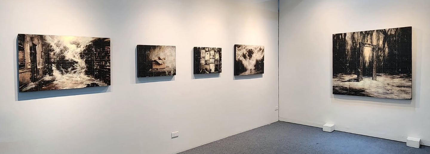 Abantao brings to light these shadows. Her images — the solitary figure, the mirror reflecting emptiness, the frayed papers — quietly pose an urgent question: Who am I beneath what the world sees? Each canvas invites you to peer inward and face what lies within.